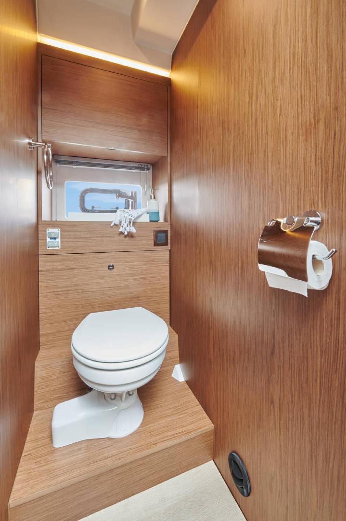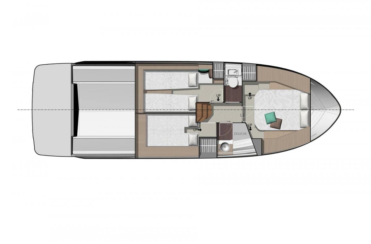 Ve spodní části plavidla je k dispozici kajuta pro hosty a pro majitele. Obě tyto kajuty jsou podobně velké. K dispozici je také konfigurace s třetí kajutou, kterou však lze využít jako úložný prostor, zde lze integrovat také druhou ledničku. NC 37 má koupelnu se samostatným sprchovým koutem. Jedná se o velkou výhodou mezi loděmi tohoto typu. Tento logicky proporcionálně rozložený interiér usnadňuje život na palubě také díky velké množství úložných prostor.
